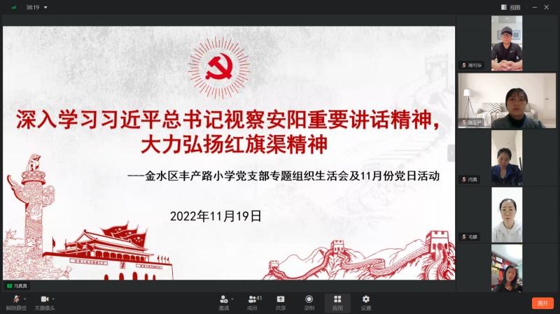 為(wei) 深入學習(xi) 貫徹黨(dang) 的二十大精神和習(xi) 近平總書(shu) 記視察河南安陽重要講話精神,將黨(dang) 的二十大精神落到實處,11月19日,鄭州市金水區豐(feng) 產(chan) 路小學黨(dang) 支部組織召開了“深入學習(xi) 習(xi) 近平總書(shu) 記視察安陽重要講話精神,大力弘揚紅旗渠精神”專(zhuan) 題組織生活會(hui) 。學校全體(ti) 黨(dang) 員齊聚“雲(yun) 端”參加此次視頻會(hui) 議,會(hui) 議由副校長陳爽主持。