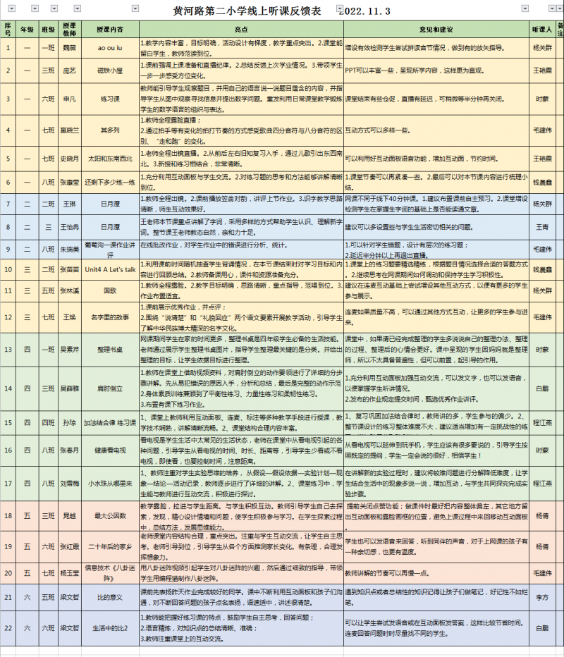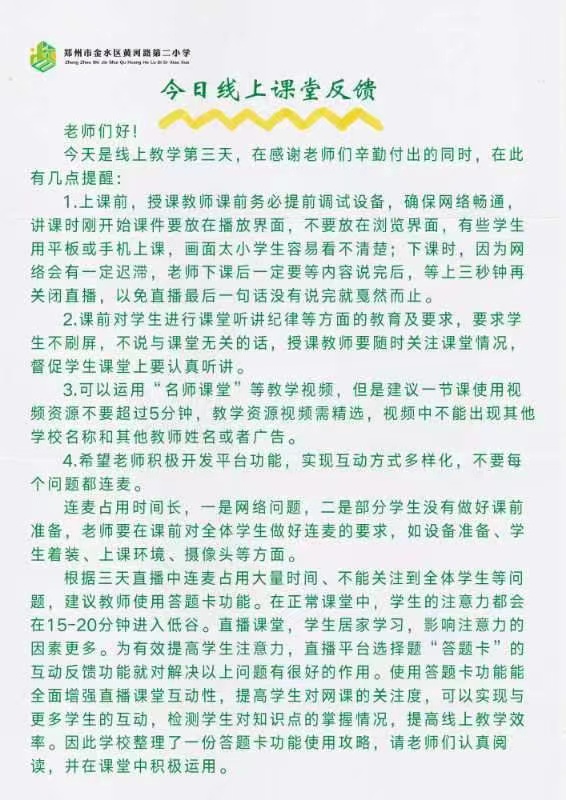 金水區黃河路第二小學對線上教學實施了網格化管理,領導班子全部下沉到教學班級,開展線上教學“三級巡課、觀課”工作,每天有巡視、聽課、記錄與(yu) 反饋,保障線上教學質量。在邀請教育發展研究中心教研員巡課聽課的同時,學校黨(dang) 總支書(shu) 記楊關(guan) 群、校長時蒙帶領全體(ti) 領導班子構建“網格化”線上教學管理模式, 校級領導分別進入各個(ge) 年級的1-2個(ge) 班級為(wei) 網格的“縱軸”,中層幹部進入分包年級為(wei) 網格的“橫軸”,全方位深入課堂、深入學生、深入家長,了解學情教情,了解師生家長需求,第一時間線上解決(jue) 問題。領導班子根據自己在線上課堂觀察到的亮點、不足及師生家長需求在班子群裏進行反饋,教導處根據的反饋情況進第一時間調整方案,解決(jue) 問題,並每天把班子成員聽課反饋表發給全體(ti) 教師,以便反思和改進。網格化管理“縱橫交錯”全方位覆蓋教學過程,全程跟進線上教學,保障線上課堂的質量高質量行進。