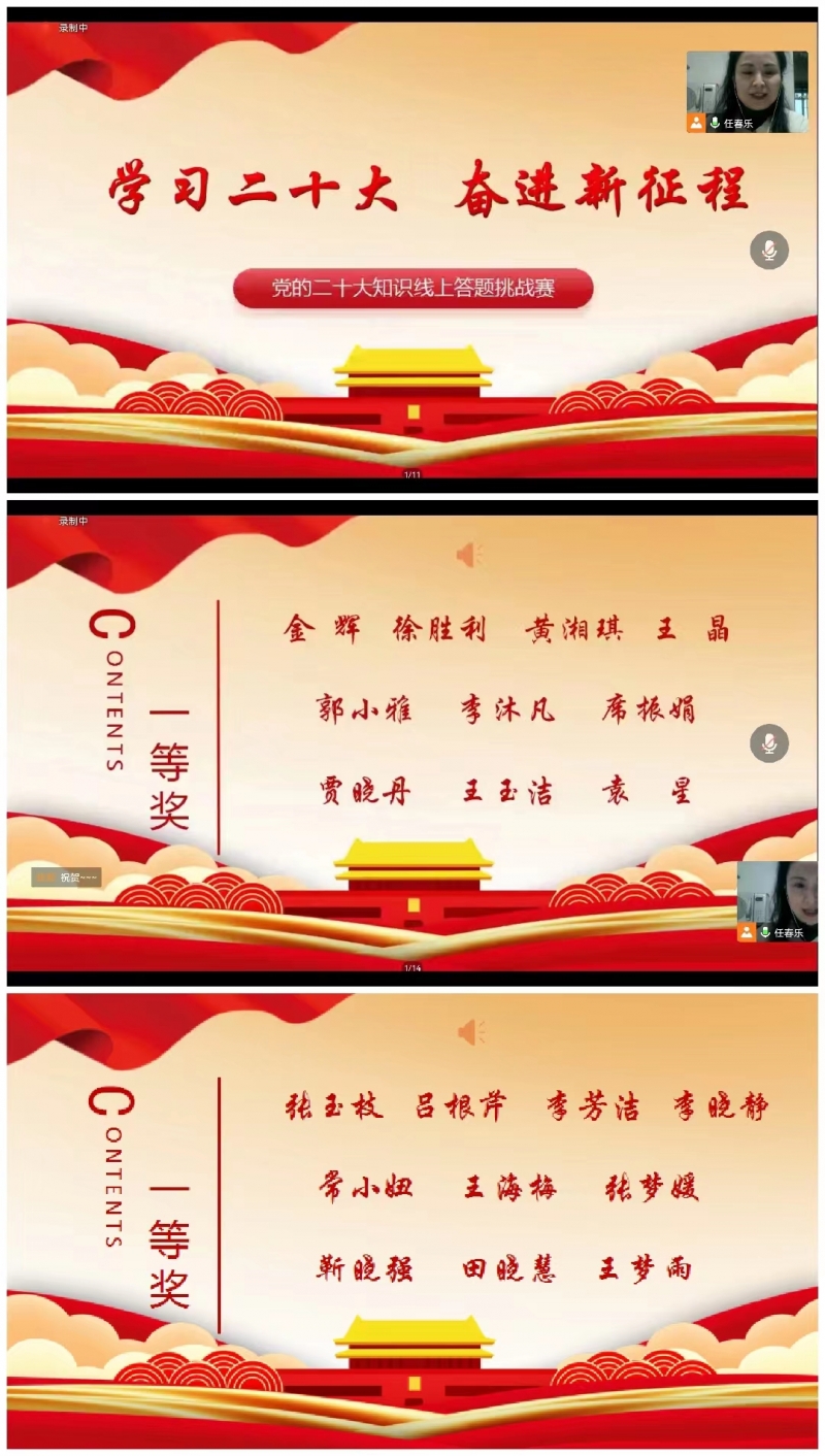 首先,全體(ti) 教師利用騰訊會(hui) 議和微信問卷星開展了“學習(xi) 二十大,奮進新征程”——黨(dang) 的二十大知識線上答題,通過完成40道專(zhuan) 題知識檢驗教師對二十大精神的學習(xi) 成果,兩(liang) 輪答題共產(chan) 生學習(xi) 標兵20名。
