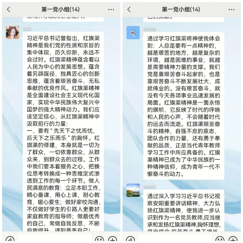 三個(ge) 黨(dang) 小組組織各組同誌結合線上教學和居家防疫的實際情況,依次對學習(xi) 紅旗渠精神做了感悟發言——“對工作埋頭苦幹、精益求精;對生活艱苦奮鬥、樂(le) 觀向上;對學生嚴(yan) 慈相濟,真心實意”“愛心、耐心、細心三心俱到,善於(yu) 發現,多鼓勵,培養(yang) 學生健康的人格,樹立學生的自信心”“用當年修建紅旗渠的幹勁,拚勁,闖勁,主動擔當作為(wei) ,克服艱難險阻,大膽迎難而上”……通過學習(xi) 和交流,全體(ti) 黨(dang) 員老師表示要以紅旗渠精神作為(wei) 自己照鏡子、正衣冠的生動教材,反思自己、檢查自己、激勵自己。