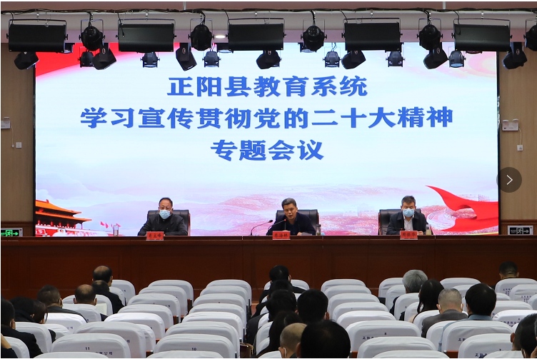 正陽縣教育局召開傳(chuan) 達學習(xi) 黨(dang) 的二十大精神專(zhuan) 題會(hui) 議,通過領學《黨(dang) 的二十大報告全文》和《習(xi) 近平在黨(dang) 的二十大閉幕式上的重要講話》,深入領會(hui) 黨(dang) 的二十大精神,安排部署教育係統學習(xi) 宣傳(chuan) 貫徹工作。