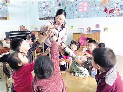 2021年全國教書(shu) 育人楷模、河南“新鄉(xiang) 師德先進群體(ti) ”成員、輝縣市西平羅鄉(xiang) 中心幼兒(er) 園園長郭文豔陪孩子們(men) 做遊戲。張紅梅 攝(資料圖片)