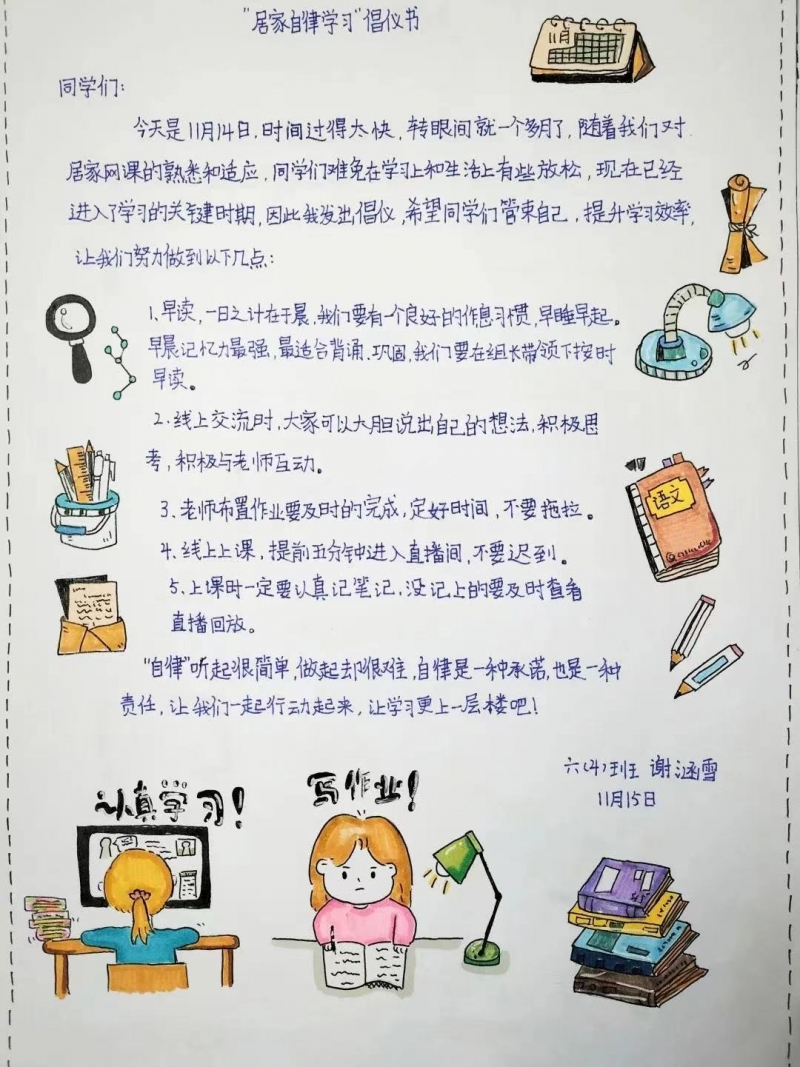 發揮課堂教學主渠道作用,推進德育融入學科教學。如道法課堂《中華民族一家親(qin) 》,通過雲(yun) 遊祖國大好河山,讓學生了解各民族的風土人情,理解和尊重不同民族的文化。語文學科依托習(xi) 作課,開展“給心心念念的老師、小夥(huo) 伴寫(xie) 一封信”“配合疫情防控”倡議書(shu) 、“居家自律學習(xi) ”倡議書(shu) 的活動,孩子們(men) 有話可說、有事可寫(xie) ,潛移默化開展感恩教育。英語學科以“禮讚二十大 我為(wei) 中國代言”為(wei) 主題,讓小水滴說一說眼中的中國,將英語教學與(yu) “愛國教育”有機結合。