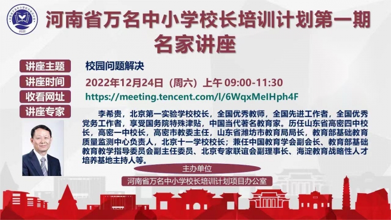 12月24日,當代教育名家李希貴應邀為(wei) 河南省“萬(wan) 名中小學校長培訓計劃”第一期1200名學員做題為(wei) 《校園問題解決(jue) 》的專(zhuan) 題講座,為(wei) 河南中小學校長傳(chuan) 經送寶,助力河南教育高質量發展。講座由河南大學教育學部副書(shu) 記、河南省“萬(wan) 名中小學校長培訓計劃”項目辦公室主任蔡建東(dong) 主持。