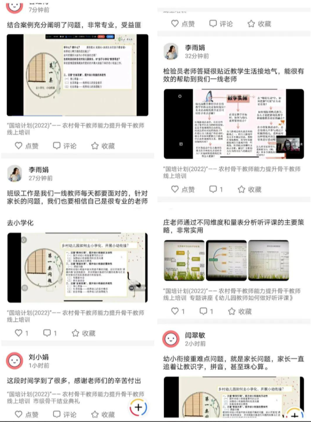 本次兩(liang) 個(ge) 骨幹教師培訓項目,均采取“13+2”的形式進行,以同步在線、異步在線、同步異步相結合、培訓平台與(yu) 微信平台切換的方式交替進行。運用現代信息技術規範管理,搭建在培訓學員網絡學習(xi) 平台、甄選優(you) 質學前教育網絡公司,力邀南京、上海等地近40名知名專(zhuan) 家園長做線上直播互動,積極創設條件為(wei) 提高線上培訓質量保駕護航。