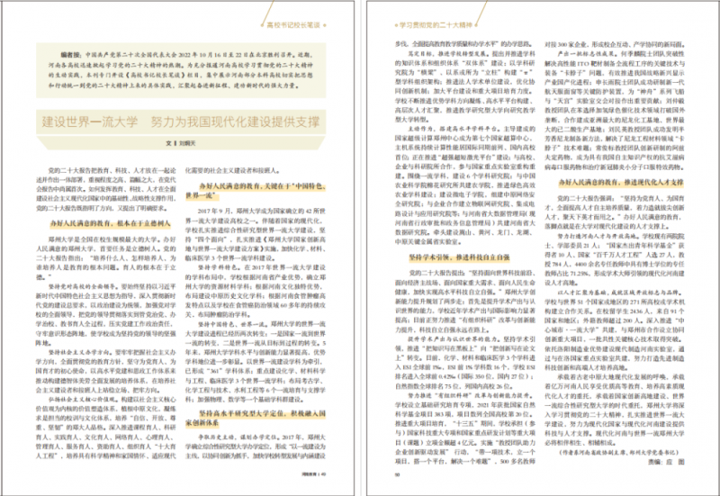 2017年9月,鄭州大學成為(wei) 國家確立的42所世界一流大學建設高校之一。伴隨著國家的現代化,學校紮實推進綜合性研究型世界一流大學建設,堅持“四個(ge) 麵向”,紮實推進《鄭州大學國家創新高地與(yu) 世界一流大學建設方案》實施,加快化學、材料、臨(lin) 床醫學3個(ge) 世界一流學科建設。