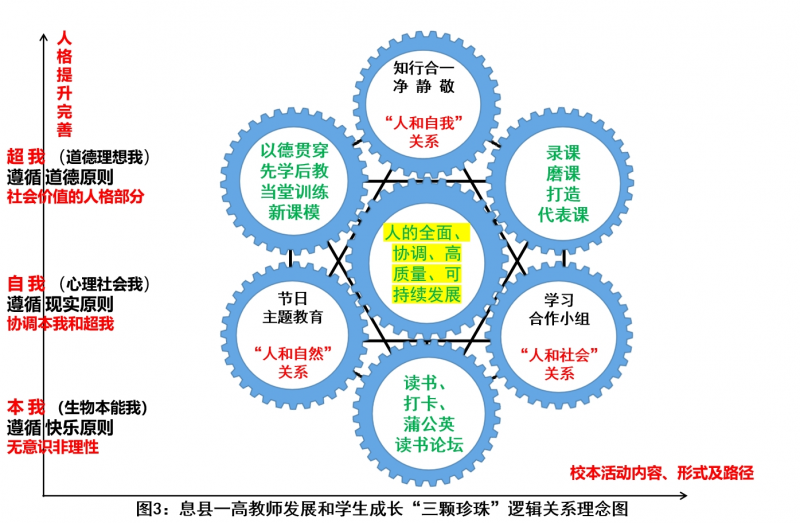 就像人格結構裏的本我、自我和超我一樣,三者相互交織,構成人格的整體(ti) 。當三者處於(yu) 協調狀態時,人格表現出一種健康狀況;當三者互不相讓,產(chan) 生敵對關(guan) 係時,就會(hui) 產(chan) 生心理疾病。而教師與(yu) 學生的發展也是一個(ge) 由“本我”到“自我”最終達到“超我”境界的過程。這需要“六顆珍珠”的相互結合、相互照耀,“六顆珍珠”是實現人格提升完善的內(nei) 容、形式及路徑。
