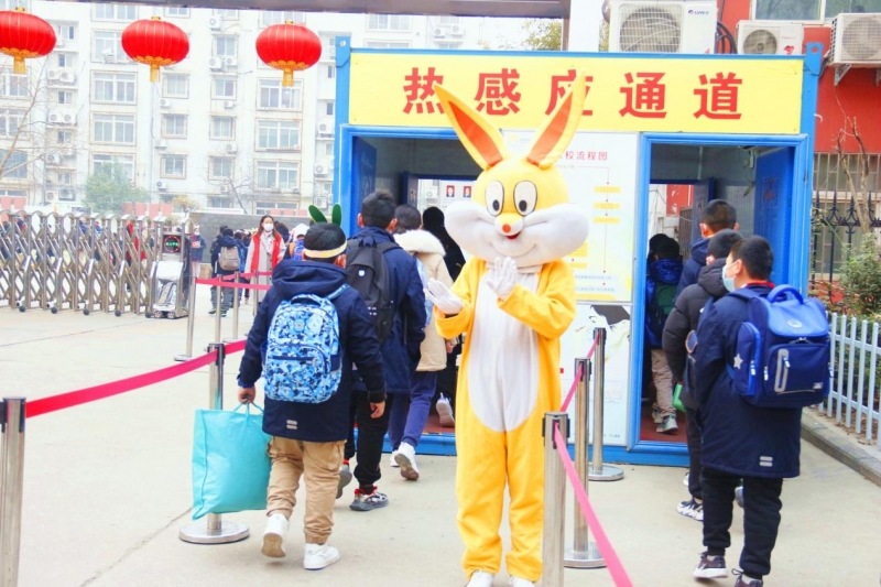 早上八點,迎著新學期的朝霞,伴著一聲聲親(qin) 切的問候,滿懷喜悅的心情,豐(feng) 產(chan) 學子們(men) 身穿整潔的校服,頭戴各具特色的兔子頭飾,邁著輕快的步伐有序排隊測溫進入校園,一張張臉上都洋溢著幸福的微笑。