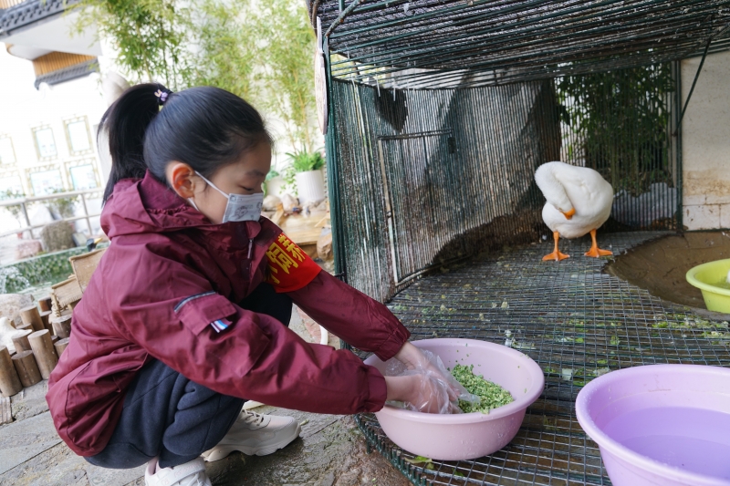 同學們(men) 在勞動中相互幫助,相互協作,相互支持。“小小飼養(yang) 員”們(men) 分工合作,有的同學拿小桶負責給大鵝換水,有的同學負責拿起水管、掃把進行衛生清理,還有的同學負責拌食、喂食。在小組成員的相扶相攜中,勞動已然變得成合作育人的契機。