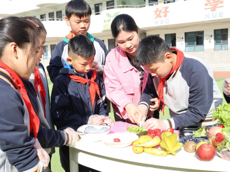 校園裏,春日校園“遊玩”活動正在進行。一棵棵新鮮嫩綠的生菜經過選、摘、洗等工序後,披著“露珠”等待“變身”。同學們(men) 在老師的指導下將生菜切成一條條、一片片。同時處理好其他材料,為(wei) 製作蔬菜水果沙拉做好準備。