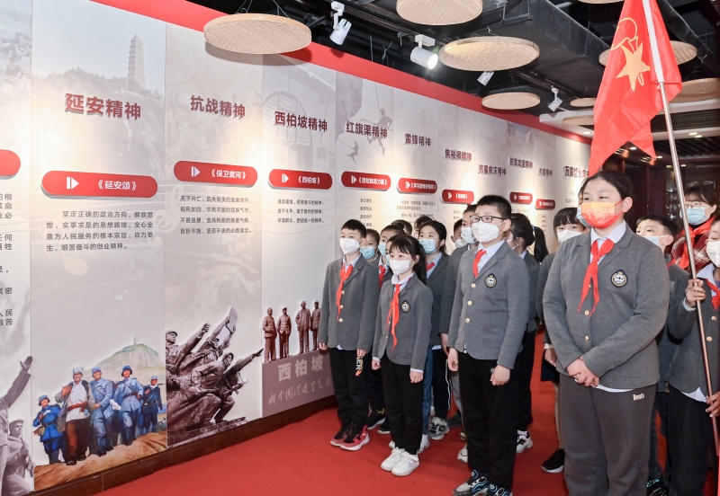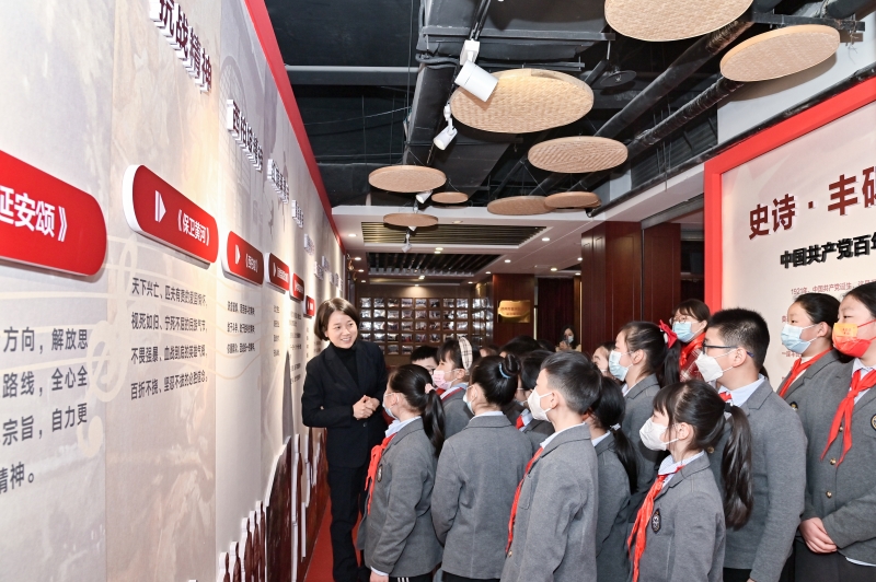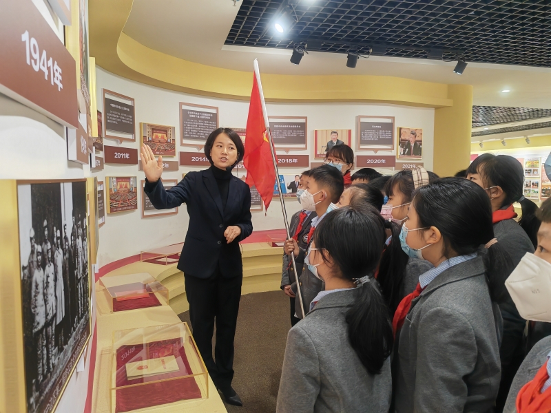 在鮮豔的少先隊隊旗的引領下,金水區南陽路第三小學四年級少先隊員代表,一走進法治展覽館,就被展館內(nei) 各種版麵與(yu) 陳設所吸引。在講解員史囡老師的帶領下,大家從(cong) “百年精神組歌·紅船精神”開始,依次參觀了“序廳”、“科學立法”“嚴(yan) 格執法”“公正司法”“古代法治”“法治案例”“青少年法治”等主題展區。