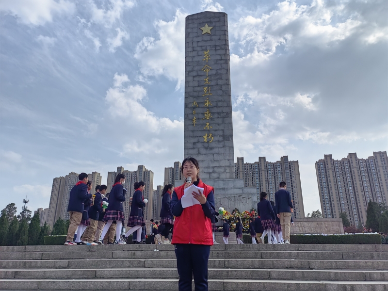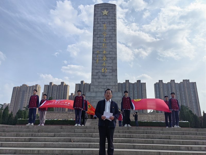 在嘹亮的國歌聲中,紀念烈士儀(yi) 式正式開始,全體(ti) 師生默哀一分鍾,國旗班代表敬獻花籃,表達對英烈的哀思。隨後,校黨(dang) 委書(shu) 記魏勇帶領全體(ti) 黨(dang) 員教師重溫入黨(dang) 誓詞。黨(dang) 員代表張嘉蕾說:“今天在莊嚴(yan) 的烈士紀念碑下,我們(men) 要牢記我們(men) 的使命和擔當,以習(xi) 近平新時代中國特色社會(hui) 主義(yi) 思想為(wei) 指導,認真學習(xi) 貫徹黨(dang) 的二十大精神,作為(wei) 黨(dang) 員幹部就是要勇擔重任,使我校教育教學工作更上一個(ge) 台階;作為(wei) 一名18中人,踏踏實實地為(wei) 自己積極而幸福的人生作準備,勇敢地為(wei) 將來服務和奉獻社會(hui) 蓄積力量,就是我們(men) 無悔的選擇。”隨後,團員代表進行詩歌朗誦,緬懷先烈,表達哀思。全體(ti) 團員重溫入團誓詞,勵誌爭(zheng) 做新時代好少年。