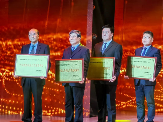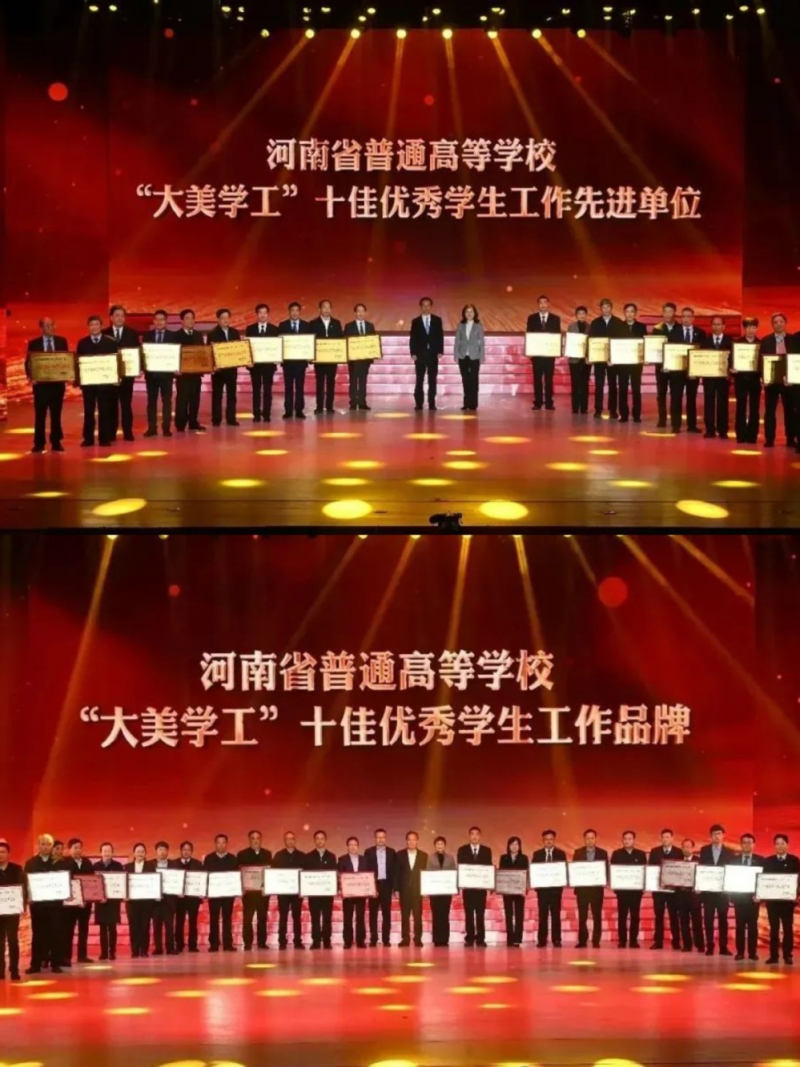 4月3日晚,河南省普通高等學校“大美學工”頒獎典禮暨學生工作優(you) 秀成果展演在洛陽師範學院舉(ju) 行。河南省委常委、洛陽市委書(shu) 記江淩,省委教育工委副書(shu) 記,省教育廳黨(dang) 組書(shu) 記、廳長毛傑等出席頒獎典禮。全省各高校領導、學生處處長及學生工作者代表等參加典禮。焦作師範高等專(zhuan) 科學校黨(dang) 委書(shu) 記張現儉(jian) ,黨(dang) 委副書(shu) 記、紀委書(shu) 記李秋生參加活動並代表學校領獎。