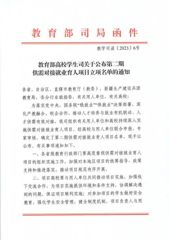 據了解,教育部供需對接就業(ye) 育人項目是落實黨(dang) 中央、國務院“穩就業(ye) ”“保就業(ye) ”決(jue) 策部署,是深化產(chan) 教融合、校企合作,推動人才培養(yang) 與(yu) 就業(ye) 有機聯動、人才供需有效對接的重要舉(ju) 措。供需對接就業(ye) 育人項目分為(wei) “定向人才培養(yang) 培訓項目”“就業(ye) 實習(xi) 基地項目”“人力資源提升項目”“重點領域校企合作項目”共四類,項目經校企對接、學校申請、用人單位申報、專(zhuan) 家審核等環節評審立項。