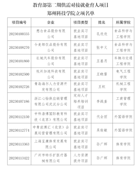 4月13日,記者從(cong) 鄭州科技學院獲悉,在近日教育部高校學生司公布的《關(guan) 於(yu) 公布第二期供需對接就業(ye) 育人項目立項名單的通知》(教學司函〔2023〕6號)中,該校與(yu) 長城汽車股份有限公司、杭州加速科技有限公司、想念食品股份有限公司等企業(ye) 合作的10個(ge) 供需對接就業(ye) 育人項目獲批立項,分布裝備製造、食品加工和文旅藝術等行業(ye) 領域。