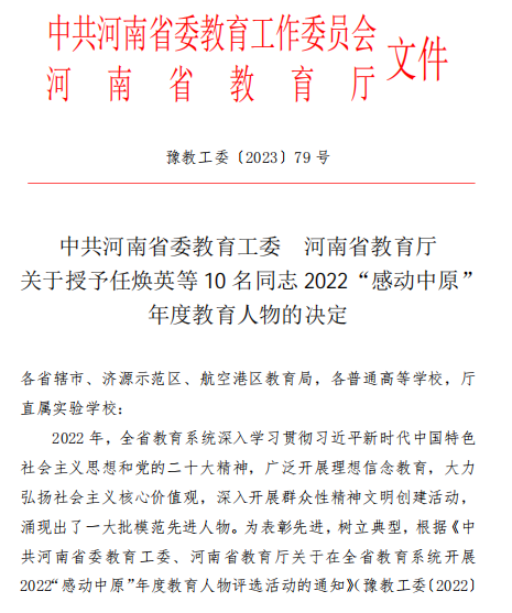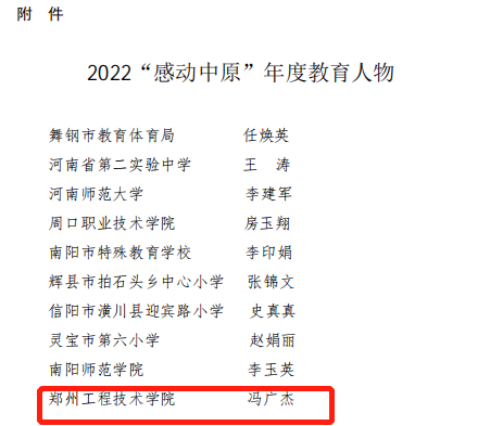 4月12日,從(cong) 省委高校工委、省教育廳傳(chuan) 來好消息,經組織推薦、專(zhuan) 家評選和網上公示等環節,鄭州工程技術學院信息工程學院馮(feng) 廣傑老師獲批2022“感動中原”年度教育人物榮譽稱號。