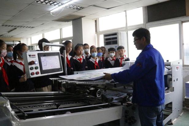 了解了印刷廠的發展曆程後,師生們(men) 跟隨魏冉經理來到印刷廠車間,隻見潔淨整齊的環境和一排排大型的印刷機器在秩序井然地運轉著。魏冉經理向大家詳細講解了各種機器的工作原理,以及書(shu) 本的製作流程。有切割機,把紙切割成半成品;印刷機,每小時能印上萬(wan) 張紙;覆膜機,在紙上覆上一層薄膜;膜切機,將做好的紙張切成各種形狀……同學們(men) 也拿好紙和筆,邊聽邊記錄下來,不放過任何一個(ge) 學習(xi) 的機會(hui) 。
