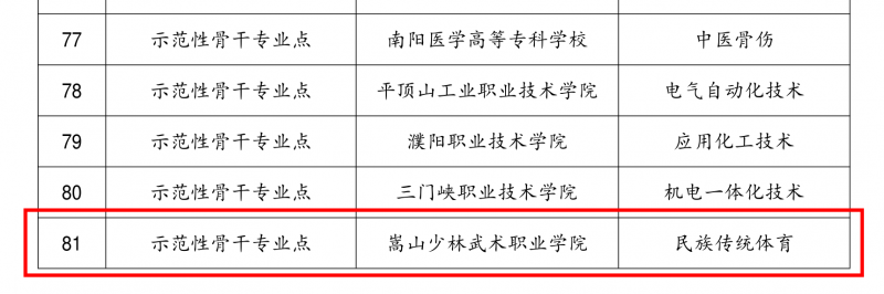 近日,kaiyun体育登入口發布了《關(guan) 於(yu) 公布 2023年河南省職業(ye) 教育示範性專(zhuan) 業(ye) 點立項建設項目名單的通知》(教職成〔2023〕131 號)文件,嵩山少林武術職業(ye) 學院民族傳(chuan) 統體(ti) 育專(zhuan) 業(ye) 獲批省級示範性骨幹專(zhuan) 業(ye) 建設點。