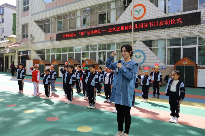 伴隨著莊嚴(yan) 的升旗儀(yi) 式,讀書(shu) 月啟動儀(yi) 式正式開始!在金水區新建幼兒(er) 園保教室副主任郭炎麗(li) 的引領下,全體(ti) 幼兒(er) 舉(ju) 起右拳一起宣誓:我宣誓要與(yu) 好書(shu) 為(wei) 伴,堅持每天讀書(shu) ,閱讀經典,閱讀文明,勤於(yu) 思考,善於(yu) 積累,浸潤書(shu) 香,快樂(le) 閱讀!