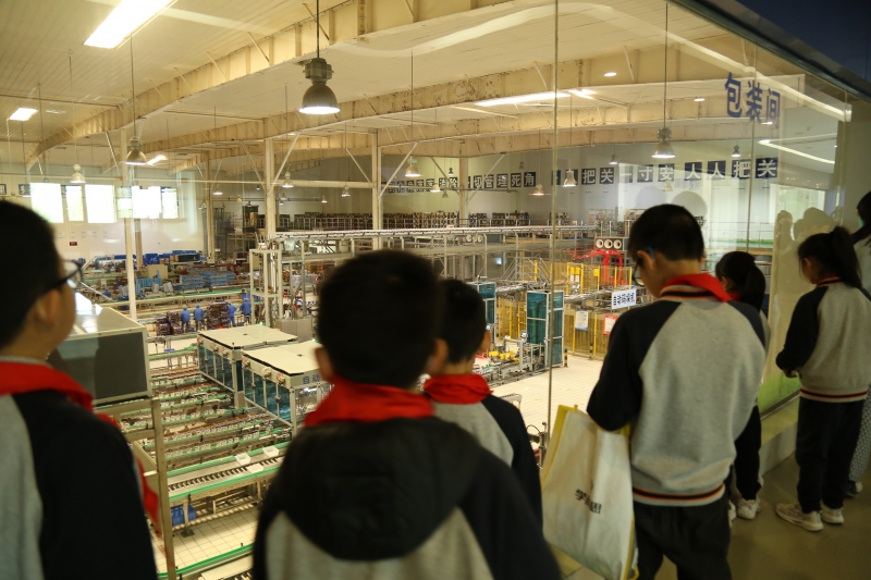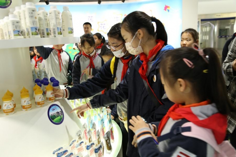 來到了二樓產(chan) 品展示區,講解員向師生介紹了關(guan) 於(yu) 奶文化、牛奶的營養(yang) 等專(zhuan) 業(ye) 知識。透過玻璃牆,龐大的先進設備讓師生驚歎不已。講解員便順勢給孩子們(men) 講解了牛奶運送到產(chan) 業(ye) 園的過程,然後帶領孩子們(men) 近距離地觀察了花花牛係統、科學、完整的工廠加工線,從(cong) 清洗車間、灌裝車間、處理車間到冷藏車間,了解每一個(ge) 車間都有自己的作用,在崗位上發揮著重要的價(jia) 值,最後為(wei) 我們(men) 創造出不同的口味,不同種類的乳製品。