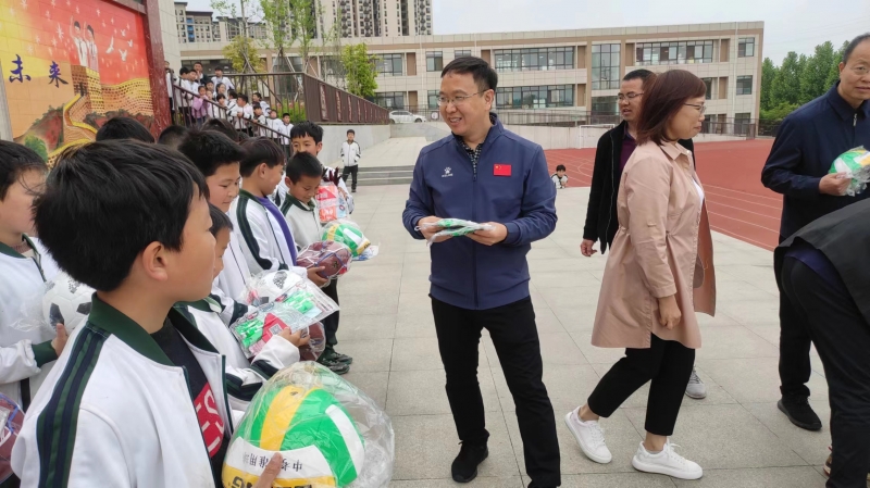 隨後,在思源學校吳迪書(shu) 記的主持下進行了物資捐贈儀(yi) 式,張書(shu) 記代表鄭州市第七十六中學全體(ti) 師生為(wei) 淅川縣思源實驗學校小學的孩子們(men) 贈送了一批體(ti) 育用品,學生們(men) 抱著排球、籃球、足球、毽球、跳繩等掩飾不住內(nei) 心的喜悅。張書(shu) 記勉勵學生們(men) 要珍惜現在良好的學習(xi) 條件,學好本領,感恩奮進,報效祖國。鄭州市第七十六中學將與(yu) 思源學校繼續進行多種形式支援支教活動,攜手前行,共譜新章。