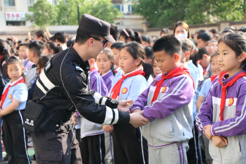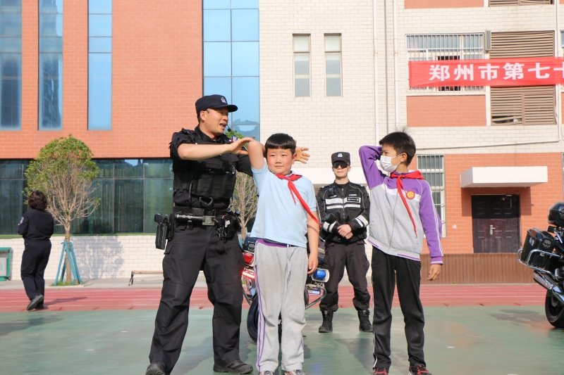 隨後,河南省公安廳警務技能戰術教官、河南警察學院公安業(ye) 務教官、三級警長王丙甲警官為(wei) 學生進行了徒手防衛術、書(shu) 包防禦術等的防暴防欺淩培訓,使學生們(men) 在此次培訓中學有所獲,在自我防護上有備無患。培訓過後孩子們(men) 依次走過裝備展示區參觀了警用摩托車、警帽、警服、警車等警用裝備,對警察的崇拜、向往之情油然而生。