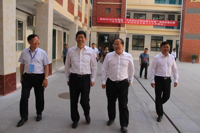 在南陽市第十七小學(中片區“萬(wan) 名班主任班會(hui) 課大比武”活動小學組)賽點,楊文普走進班會(hui) 課大比武活動現場,認真查看班主任老師比賽狀況,詳細詢問評委組成及評分情況,對參賽選手精彩表現感到滿意,對臥龍區、南陽市第十七小學的精心組織給予充分肯定。