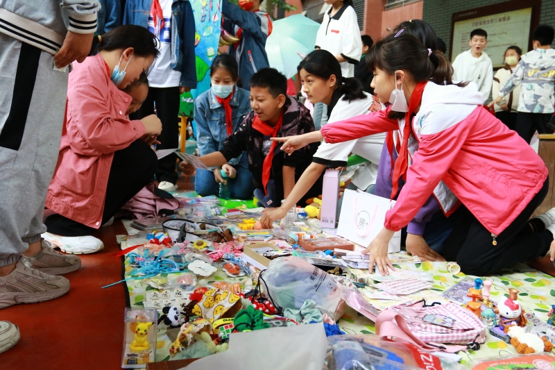 活動開始後,人潮湧動,叫賣聲此起彼伏。同學們(men) 變身“小攤主”,熱情地招攬著顧客,把精致的商品展示給大家看,與(yu) 化身顧客的老師和同學討價(jia) 還價(jia) ,用自己的“生意理念”管理著自己的攤位。身邊隨處可見買(mai) 到心儀(yi) 的物品而笑逐顏開的買(mai) 主,和掙到“第一桶金”而開心地數著“收入”的賣家,操場成為(wei) 了歡樂(le) 的大賣場。