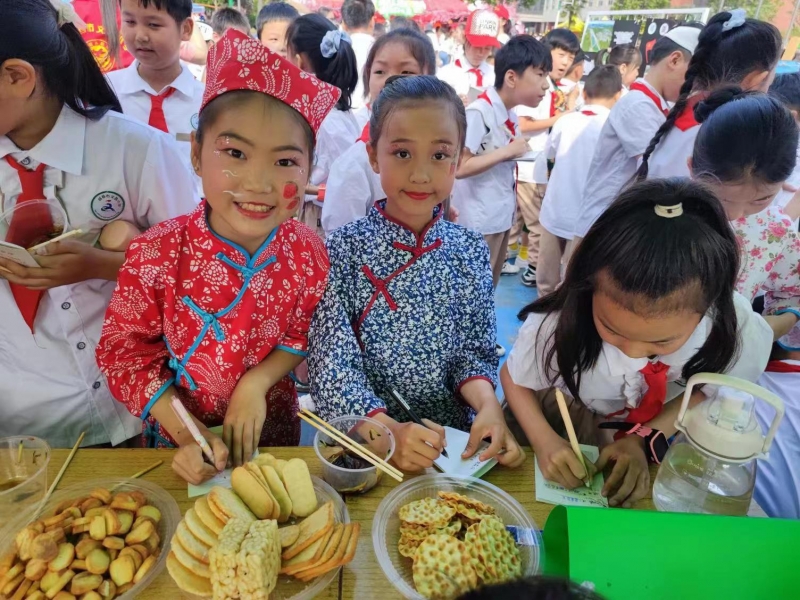 輝縣市文昌小學“走讀共城·鄉(xiang) 情”慶“六一”校園家鄉(xiang) 遊活動分為(wei) 兩(liang) 個(ge) 篇章,第一篇章文藝匯演“共城回響,禮讚輝縣”——《踏歌起舞慶豐(feng) 收》《走鄉(xiang) 情,扭鄉(xiang) 韻》《輝縣精神放光芒》3個(ge) 節目為(wei) 師生展示了輝縣市的曆史演變、精神凝聚和鄉(xiang) 鎮發展的變化與(yu) 成果;第二篇章校園微展“共城足跡,醉美家鄉(xiang) ”——將輝縣市22個(ge) 鄉(xiang) 鎮的鄉(xiang) 土特色、文化和10個(ge) 風景區的自然風光濃縮成校園微展。孩子們(men) 手持“家鄉(xiang) 遊曆卡”,觀看展板、觸摸實物、聽解說記錄足跡和見聞,走進山水、走進家鄉(xiang) ,通過親(qin) 身體(ti) 驗特色活動,深人感受家鄉(xiang) 的獨特風情和人文魅力。