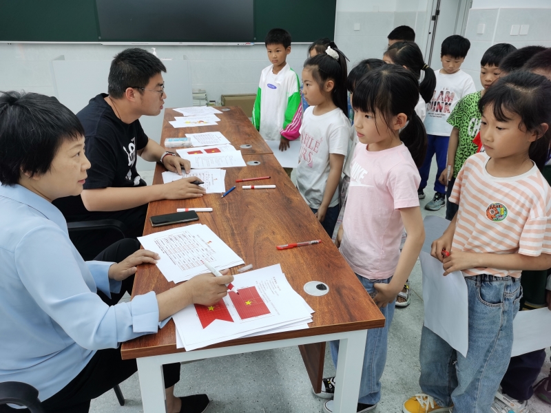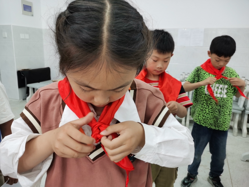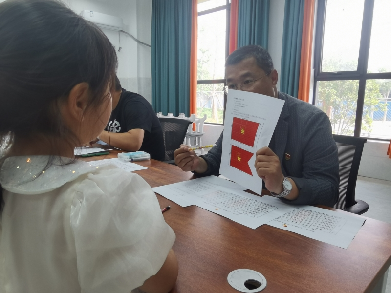 在黨(dang) 總支書(shu) 記賈偉(wei) 濤的帶領下,一年級班主任周鳳宇、副班主任蔡蕊對每位預備隊員進行考核,根據考生表現在入隊爭(zheng) 章卡上畫上紅星。
