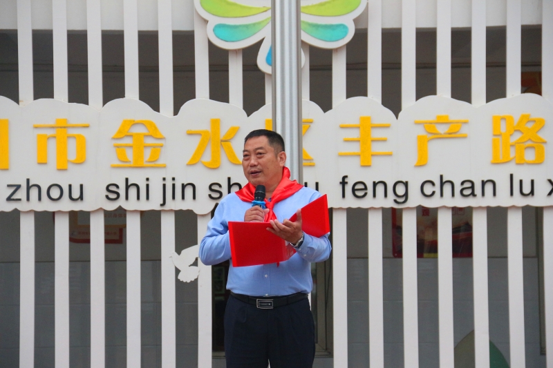 在星星火炬下,大隊委員劉晨菲宣讀新隊員名單,五年級的少先隊員們(men) 向新隊員授紅領巾並互相敬隊禮,紅旗一角係胸前,中國未來在我肩。光榮的少先隊員離不開優(you) 秀的隊伍,離不開優(you) 秀的指引者。金水區豐(feng) 產(chan) 路小學黨(dang) 支部書(shu) 記、校長陳鵬為(wei) 八個(ge) 新中隊授中隊旗,副校長李廣英為(wei) 各中隊輔導員老師頒發聘書(shu) 。隊旗迎風飄揚,新隊員們(men) 神采奕奕,他們(men) 驕傲地挺起胸,在德育副主任馮(feng) 真真的帶領下舉(ju) 起右拳莊嚴(yan) 宣誓。錚錚誓言,鏗鏘有力,稚嫩而又堅毅的臉龐表現出他們(men) 的堅定信念和決(jue) 心。