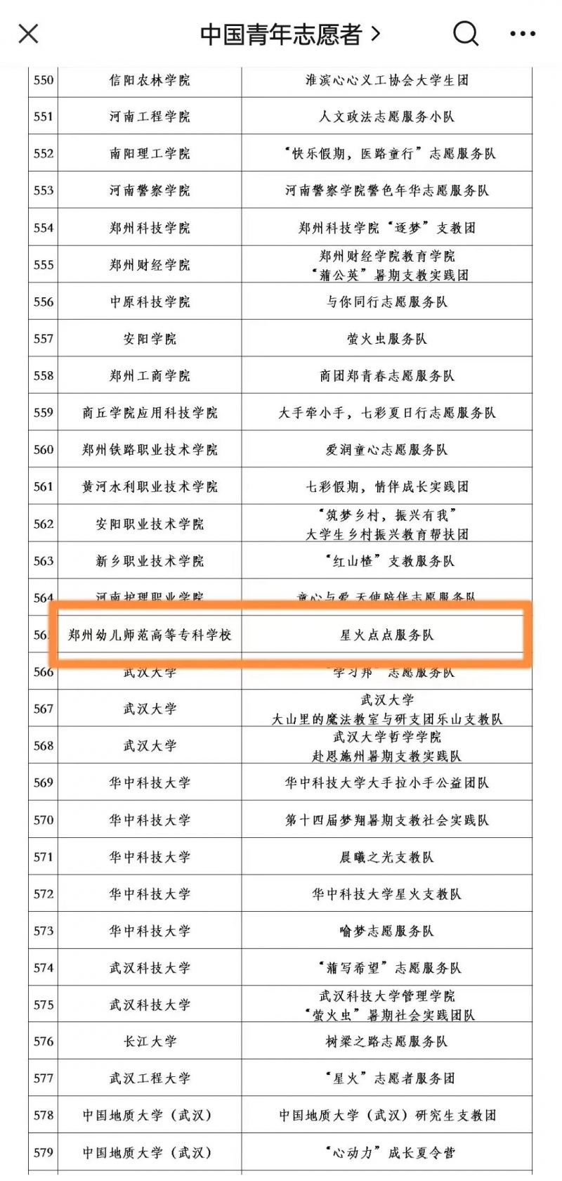 最終,團中央從(cong) 全國1000所高校的3762支誌願服務團隊中遴選出1000支2023年“七彩假期”誌願服務示範團隊,鄭州幼兒(er) 師範高等專(zhuan) 科學校學前教育學院的“星火點點服務隊”成功入選!