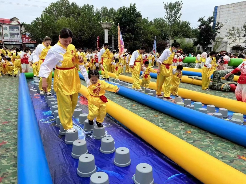 豐(feng) 富多彩的趣味親(qin) 子遊戲活動在表演結束後進行。社區工作人員提前在場地布置好千斤閘、萬(wan) 刺牆、梅花樁等改編自傳(chuan) 統武術訓練項目的充氣道具,兒(er) 童與(yu) 家長在道具中鑽、爬、跑、跳,家長配合通關(guan) 。這不僅(jin) 增強了他們(men) 身體(ti) 的靈活性、協調性與(yu) 平衡力,更使其沉浸在一段難得的親(qin) 子時光裏。