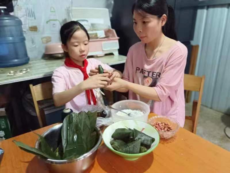 活動期間,隊員們(men) 還進行了家庭勞動實踐活動——包粽子。家長先為(wei) 孩子演示粽子的製作過程,詳細講解了粽子的包法和注意事項。“包粽子講究手法和力度,稍不注意,粽葉就破了。”有家長指出。孩子們(men) 認真觀察、用心實踐,將粽葉慢慢卷成漏鬥狀,放上糯米和紅棗,壓實蓋緊後用線繩係緊,包得有模有樣、不亦樂(le) 乎。不一會(hui) 兒(er) ,一個(ge) 個(ge) 形態各異的“童心粽”從(cong) 孩子們(men) 的小手中“誕生”了。