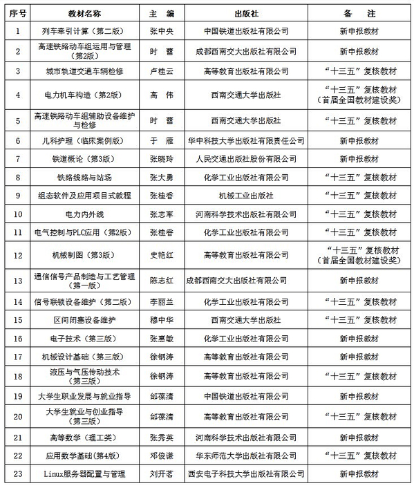 近日,教育部辦公廳發布了《關(guan) 於(yu) 公布首批“十四五”職業(ye) 教育國家規劃教材書(shu) 目的通知》(教職成廳函〔2023〕19號),鄭州鐵路職業(ye) 技術學院教師主編的23部教材成功入選,其中10部為(wei) 新申報教材、13部為(wei) 國家“十三五”複核教材。