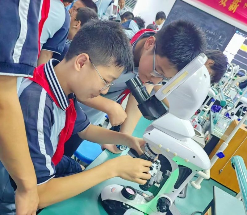 同學們(men) 進入實驗室,目光立即鎖定在數碼顯微鏡上,鄭州市第七高級中學侯琰琪老師利用數碼顯微鏡,展示了高中部學生觀察裝片時保存下來的精美圖片,例如:水藻的葉綠體(ti) 、參與(yu) 呼吸作用的線粒體(ti) 、正在分解的細胞、染色後的脂肪顆粒、運輸氧氣的紅細胞等。在侯琰琪老師的講解與(yu) 指導下,學生們(men) 先後做了以下五個(ge) 生物實驗:生物組織中還原性糖的檢測、蛋白質的檢測、澱粉的檢測、有色體(ti) 中胞間連絲(si) 的觀察及汙水中小生物的觀察。