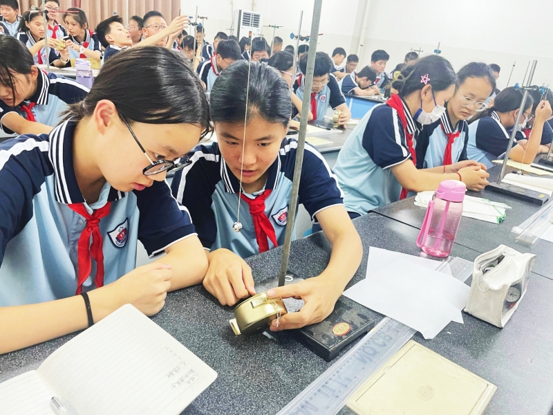 在物理實驗室,鄭州市第七高級中學李書(shu) 娟老師通過“用單擺測定重力加速度”的實驗,使學生沉浸式感受物理實驗的魅力。在實驗過程中,李老師帶領大家體(ti) 驗單擺、用遊標卡尺測量小球直徑、學習(xi) 停表的使用。在李書(shu) 娟老師的指導下,同學們(men) 用單擺測定了重力加速度,驗證了動量守恒。雖然是第一次接觸物理知識,但是同學們(men) 聽的格外認真,詳細的記錄筆記。