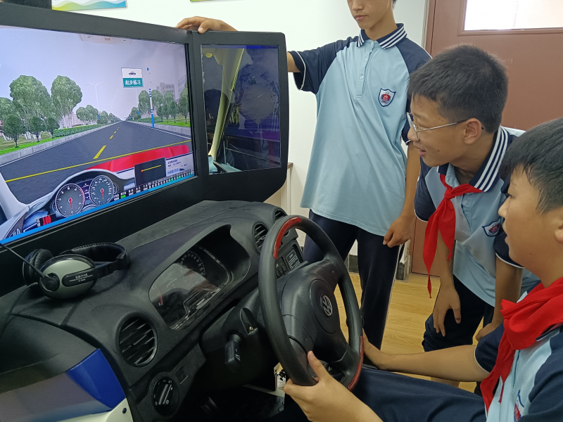 走進汽車模擬室,首先映入眼簾的是一輛汽車模型和發動機模型,陳春雨老師向同學們(men) 介紹了汽車的基本結構和發動機的運行裝置,讓同學們(men) 對汽車有了更深的了解。在五樓的汽車模擬駕駛實驗室,同學們(men) 分組圍在汽車模擬駕駛器的旁邊,機器體(ti) 型雖小,駕駛難度卻不小,換擋,踩離合器,拉手刹……同學們(men) 躍躍欲試又手忙腳亂(luan) ,陳老師為(wei) 每組同學進行單獨指導示範,還為(wei) 同學們(men) 講解了關(guan) 於(yu) 交通安全的法律法規,讓同學們(men) 對駕駛汽車有了更全麵的了解。