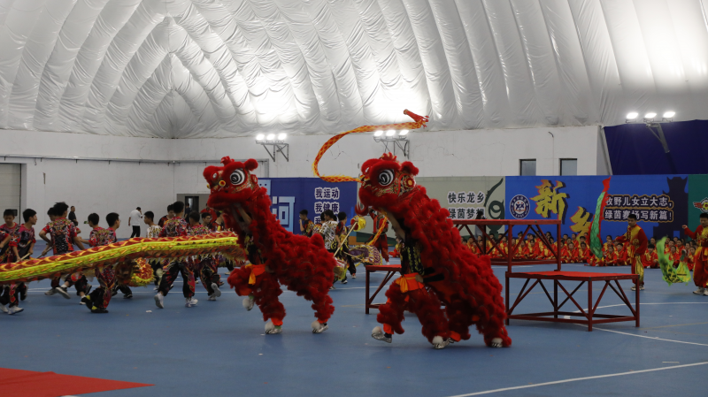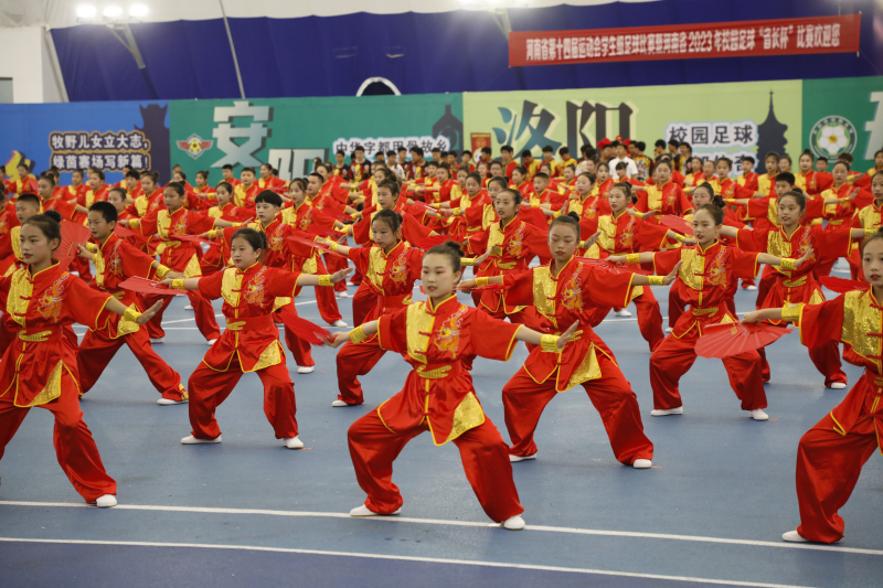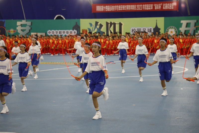 開幕式現場,來自開封市晉安小學、開封市第二師範附屬小學、河南大學附屬中學的近800名師生,進行了花樣跳繩、功夫扇、舞獅等精彩的文體(ti) 表演。