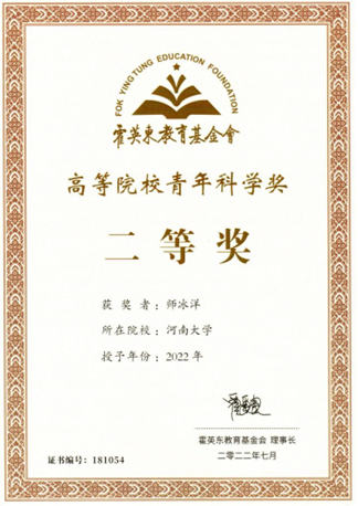 在“慶祝香港回歸祖國25周年”之際,霍英東(dong) 教育基金會(hui) 第18屆高等院校青年科學獎及教育教學獎頒獎活動在北京和香港連線舉(ju) 行。河南大學青年教師冰洋博士榮獲高等院校青年科學獎二等獎。