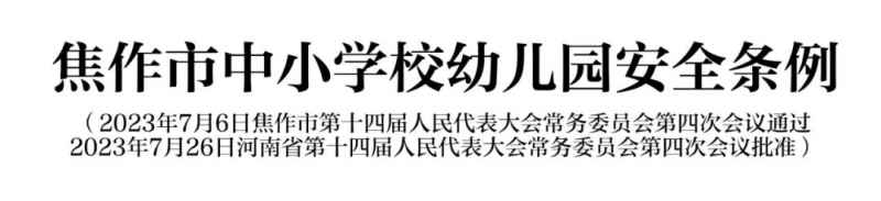 《焦作市中小學校幼兒(er) 園安全條例》已經焦作市第十四屆人民代表大會(hui) 常務委員會(hui) 第四次會(hui) 議於(yu) 2023年7月6日通過,河南省第十四屆人民代表大會(hui) 常務委員會(hui) 第四次會(hui) 議於(yu) 2023年7月26日批準,現予公布,自2023年10月1日起施行。