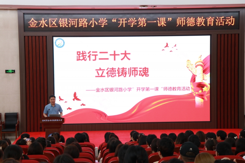 仿宋為(wei) 深入學習(xi) 貫徹習(xi) 近平總書(shu) 記關(guan) 於(yu) 教育的重要論述和全國、省、市教育大會(hui) 精神,激勵廣大教師和教育工作者不忘初心,立德樹人,厚植愛國情懷,把思想政治與(yu) 師德師風建設擺在教師隊伍建設的首要位置,通過塑造教師共同價(jia) 值追求,激勵教師成為(wei) 學生為(wei) 學、為(wei) 事、為(wei) 人的“大先生”。根據上級工作部署,結合學校的實際情況,2023年8月24日上午,金水區銀河路小學組織全體(ti) 教職工開展“開學第一課”師德教育活動。