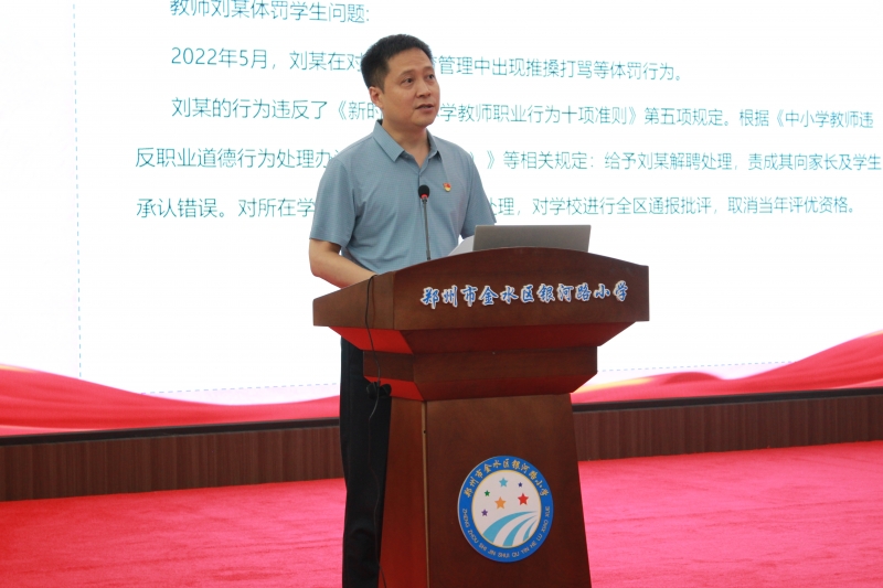 活動中,學校黨(dang) 支部書(shu) 記、校長劉均雅帶領全體(ti) 教職工共同學習(xi) 《鄭州市中小學教師違反職業(ye) 道德行為(wei) 處理實施細則(試行)》,要求教師統一思想,明確責任,自省自警,堅守師德底線。