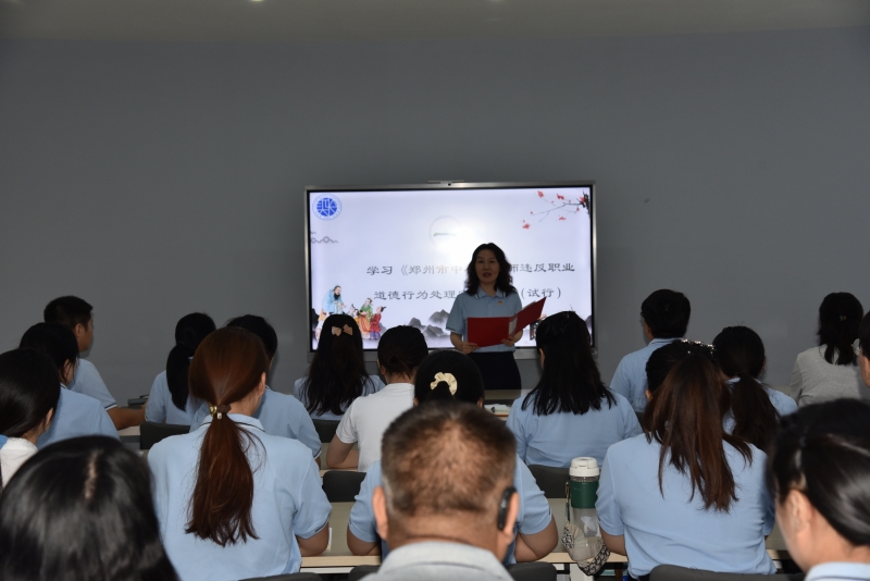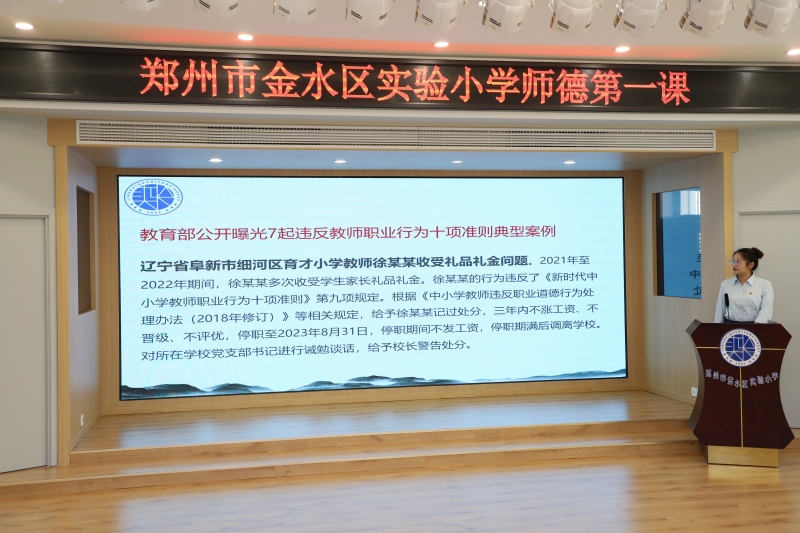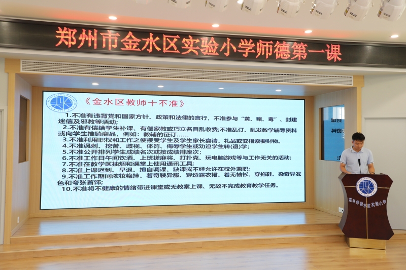 新教師頓棟欽代表帶領大家一起學習(xi) 《金水區教師十不準》。提醒大家要以更高更嚴(yan) 的標準要求自己,時刻對照反思,切實增強遵紀守法的思想自覺和行動自覺,堅守師德,以愛育人。