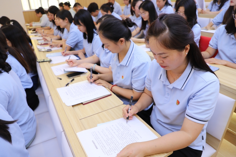 為(wei) 深入學習(xi) 貫徹習(xi) 近平總書(shu) 記關(guan) 於(yu) 教育的重要論述,激勵全體(ti) 教師不忘初心,立德樹人,厚植愛國情懷,把思想政治與(yu) 師德師風建設擺在教師隊伍建設的首要位置,通過塑造教師共同價(jia) 值追求,激勵教師成為(wei) 學生為(wei) 學、為(wei) 事、為(wei) 人的“大先生”。8月28日,金水區實驗小學教育集團開展了新學期“師德第一課”集中教育活動。黨(dang) 支部書(shu) 記、校長羅禕璠和德育主任張麗(li) 娟分別帶領兩(liang) 個(ge) 校區的老師學習(xi) 《鄭州市中小學教師違反職業(ye) 道德行為(wei) 處理實施細則(試行)》,強調全體(ti) 教師要深以貫徹二十大精神,牢記為(wei) 黨(dang) 育人、為(wei) 國育才的初心使命。一紙誓約,一份承諾,全體(ti) 教師簽訂《師德師風承諾書(shu) 》,承諾依法執教,堅定育人信念。
