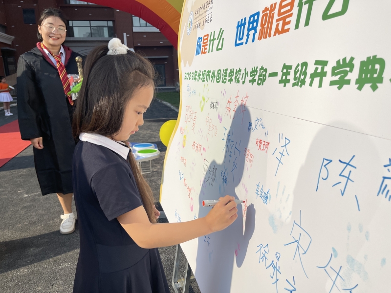 上午八點,一年級的學生盛裝出席,穿著帥氣的宇航員製服、俏皮美麗(li) 的公主裙、酷酷的奧特曼裝……在爸爸媽媽的陪伴下踏上“入學毯”,走進“入學門”。孩子們(men) 一筆一畫在簽名牆上寫(xie) 下自己的名字,按上自己的小手印,照片定格了一張張可愛的笑臉。