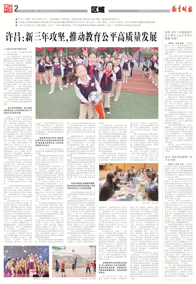 為(wei) 繼續推動許昌教育高質量發展,未來,許昌市將在三方麵發力:一是盯牢項目抓進度。對未開工項目,“一校一策”製訂方案,保證任務不減、項目不丟(diu) 。對已經開工還未建成投用的項目,瞄準台賬、倒排工期,提速度、保質量,確保按照時間節點穩步推進。二是精準科學謀發展。在對兩(liang) 輪攻堅和綜合改革全麵梳理總結的基礎上,結合上級關(guan) 於(yu) 教育工作一係列新部署新要求,圍繞辦好人民滿意的教育,製定出台加快建設教育強市的實施意見,對今後一個(ge) 時期的教育工作目標、重點任務、保障措施進行係統謀劃。三是搶抓機遇提質量。對全市中小學辦學質量進行“全麵體(ti) 檢”,貫通課程、教學、考試、評價(jia) 改革,統籌校長、教師、教研員三支隊伍建設,實現小初高學生培養(yang) 一體(ti) 設計、係統銜接、梯次發展,全麵提升教育教學質量。緊緊抓住即將實行“3+1+2”高考的良好機遇,深入推進育人方式和新課程、新高考等多項改革,把各項工作紮紮實實完成好,力爭(zheng) 實現“彎道超車”,推動教育教學質量邁上新台階。