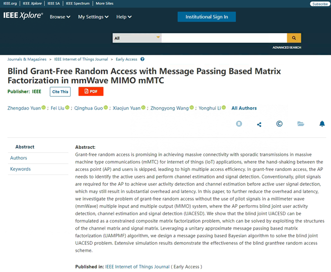 本月國際頂級期刊《IEEE Internet of Things Journal》(物聯網)發表了河南開放大學袁正道老師以河南開放大學為(wei) 第一作者單位的科研論文《Blind Grant-Free Random Access with Message Passing Based Matrix Factorization in mmWave MIMO mMTC》(基於(yu) 矩陣分解的盲免接入隨機訪問毫米波大規模機器通信模型)。該論文提出了麵向6G中物聯網和空天一體(ti) 化通信的數學模型與(yu) 算法,從(cong) 基礎上建模了大規模機器通信係統架構,對於(yu) 6G通信及其物聯網應用具有重要理論價(jia) 值。發表該論文的《物聯網》期刊為(wei) 中科院一區,影響因子達10.6,這也是學校首次以第一作者單位發表影響因子破10的高水平SCI論文。