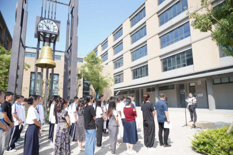 上午10點10分,伴隨著悲壯的《鬆花江上》歌曲聲,整個(ge) 校園一片肅穆,全體(ti) 師生默哀三分鍾,表達對先烈的緬懷和紀念。之後,在鄭州市103中學高二教學樓前的“非攻鍾”景觀一側(ce) ,學校領導、全體(ti) 黨(dang) 員教師、學生團員代表學生和共同進行莊嚴(yan) 宣誓,並鄭重進行撞鍾儀(yi) 式,以14聲鍾響提醒全體(ti) 師生和家長銘記長達14年的抗戰曆史。