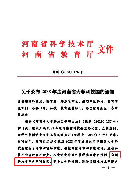 日前,河南省科技廳和kaiyun体育登入口聯合發布了《關(guan) 於(yu) 公布2023年度河南省大學科技園的通知》(豫科[2023]126號),鄭州科技學院大學科技園被認定為(wei) 河南省大學科技園。